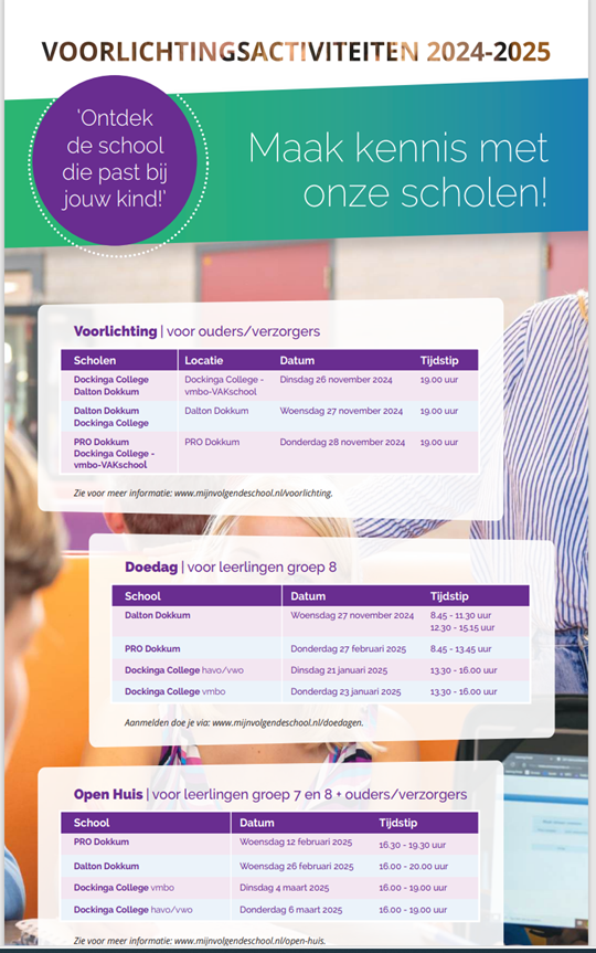 Bij belangrijke data vindt u informatie over de voorlichtingsavonden, meeloopdag en open dag.